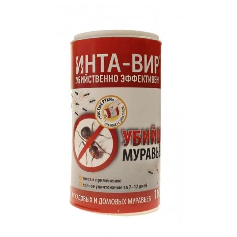 - Высокоэффективное средство Инта-вир для уничтожения всех типов муравьев в доме, саду и на участках. Средство действует по принципу "Эпидемии" - муравьи приносят приманку в муравейник и кормят всех муравьёв, что приводит к гибели. Полное уничтожение за 7-12 дней. Банка оснащена дозатором - удобно использовать, не требуются мерные ёмкости.